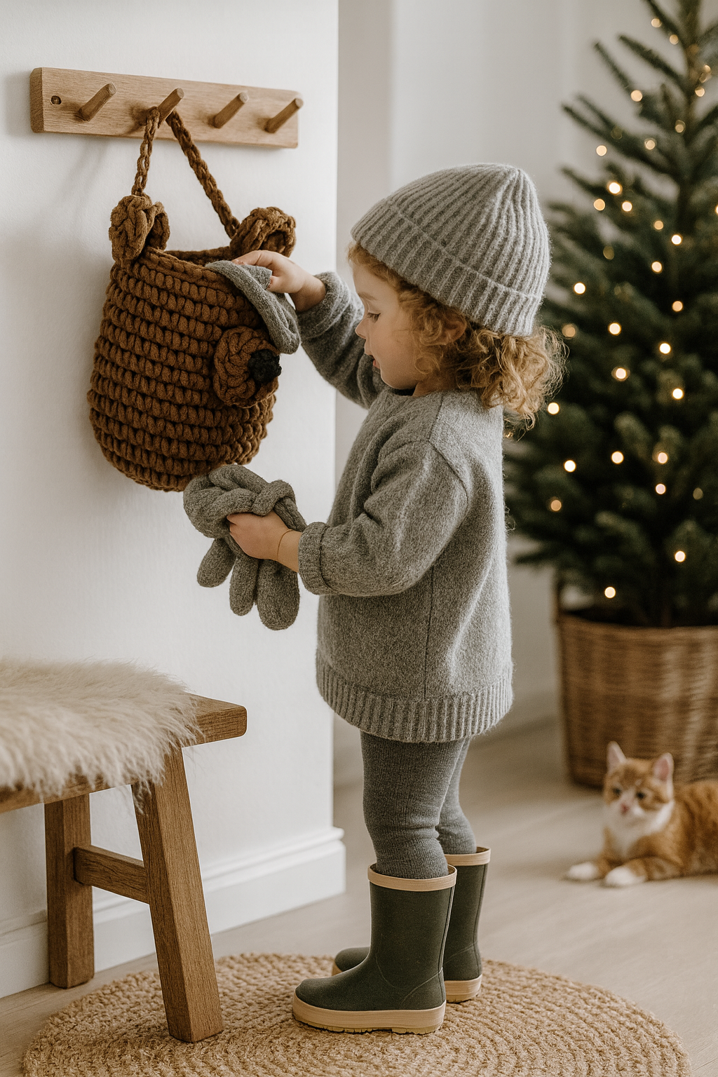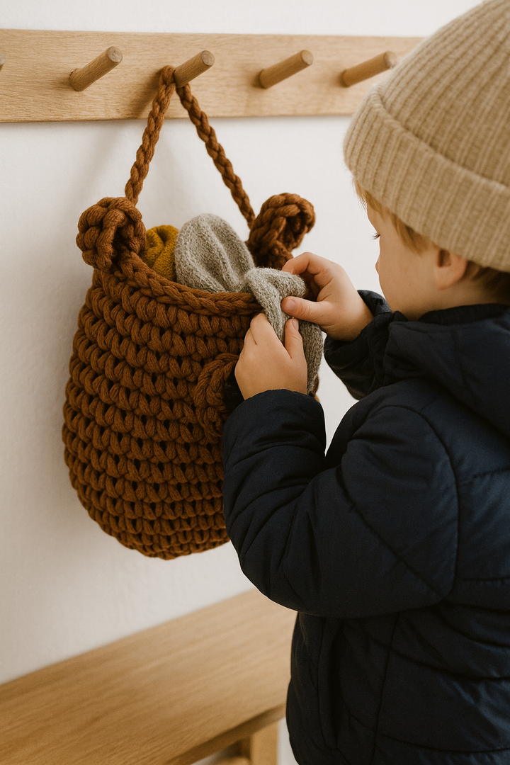 This adorable crochet hanging bear basket is not only a sweet decorative touch but also a wonderfully practical helper. Perfect for children’s rooms, hallways, nurseries, or cosy corners of your home, this friendly little bear will gladly hold mittens, hats, pyjamas, toys, LEGO bricks, and all those tiny treasures that need a special place. It brings both warmth and organisation - exactly the kind of handmade magic we love.