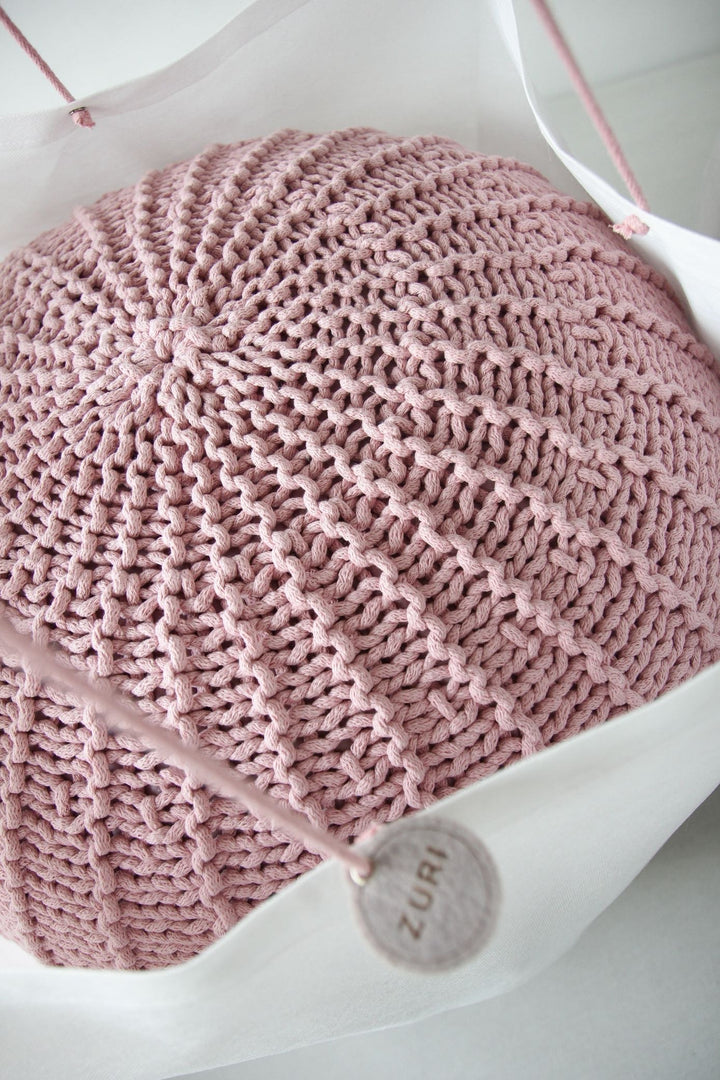 Small powder pink cotton pouffe, hand-knitted